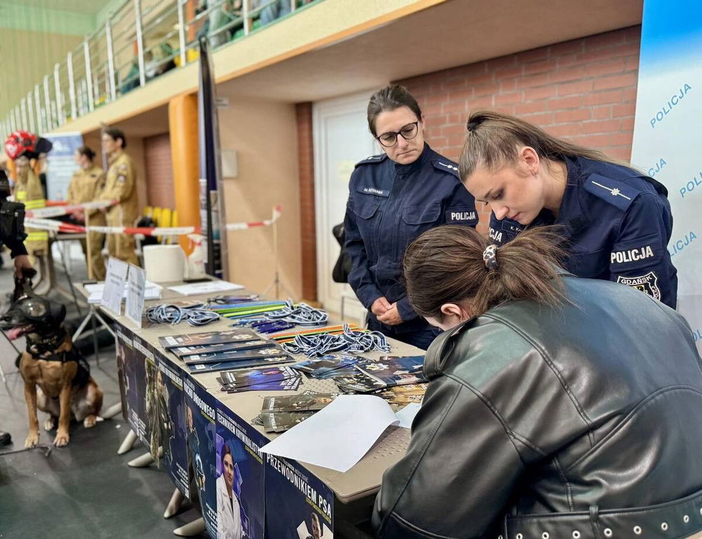 Technik kryminalistyki z Komendy Wojewódzkiej Policji w Gdańsku prezentował metody zabezpieczania śladów i pracę w laboratorium kryminalistycznym. przedstawicielka Wydziału Doboru i Szkolenia tłumaczyła wymagania i ścieżkę rekrutacji do Policji. Przewodnik psa służbowego pokazywał współpracę psa i przewodnika w działaniach operacyjnych, a drogówka udostępniła motocykl i sprzęt wykorzystywany w patrolach.